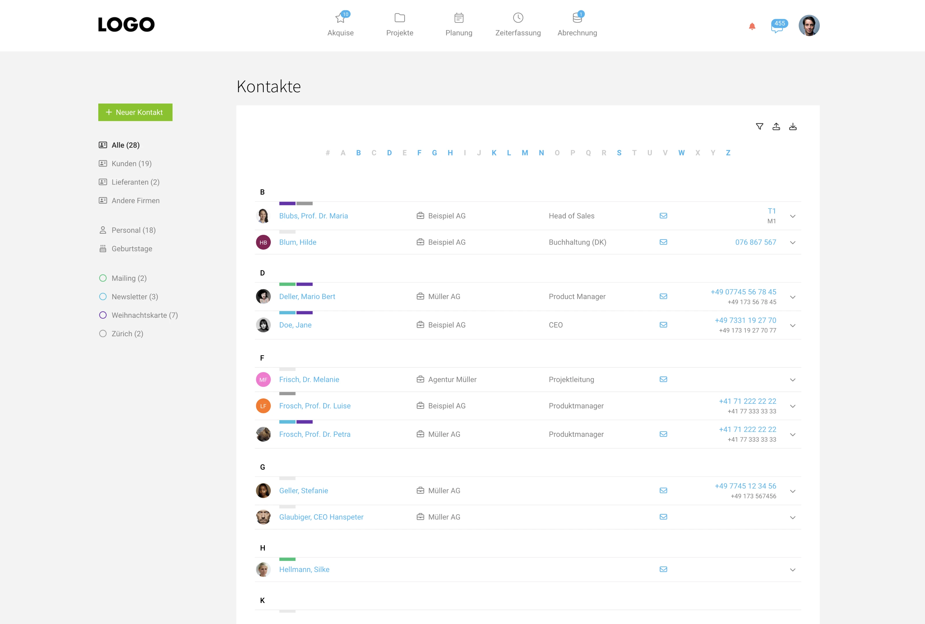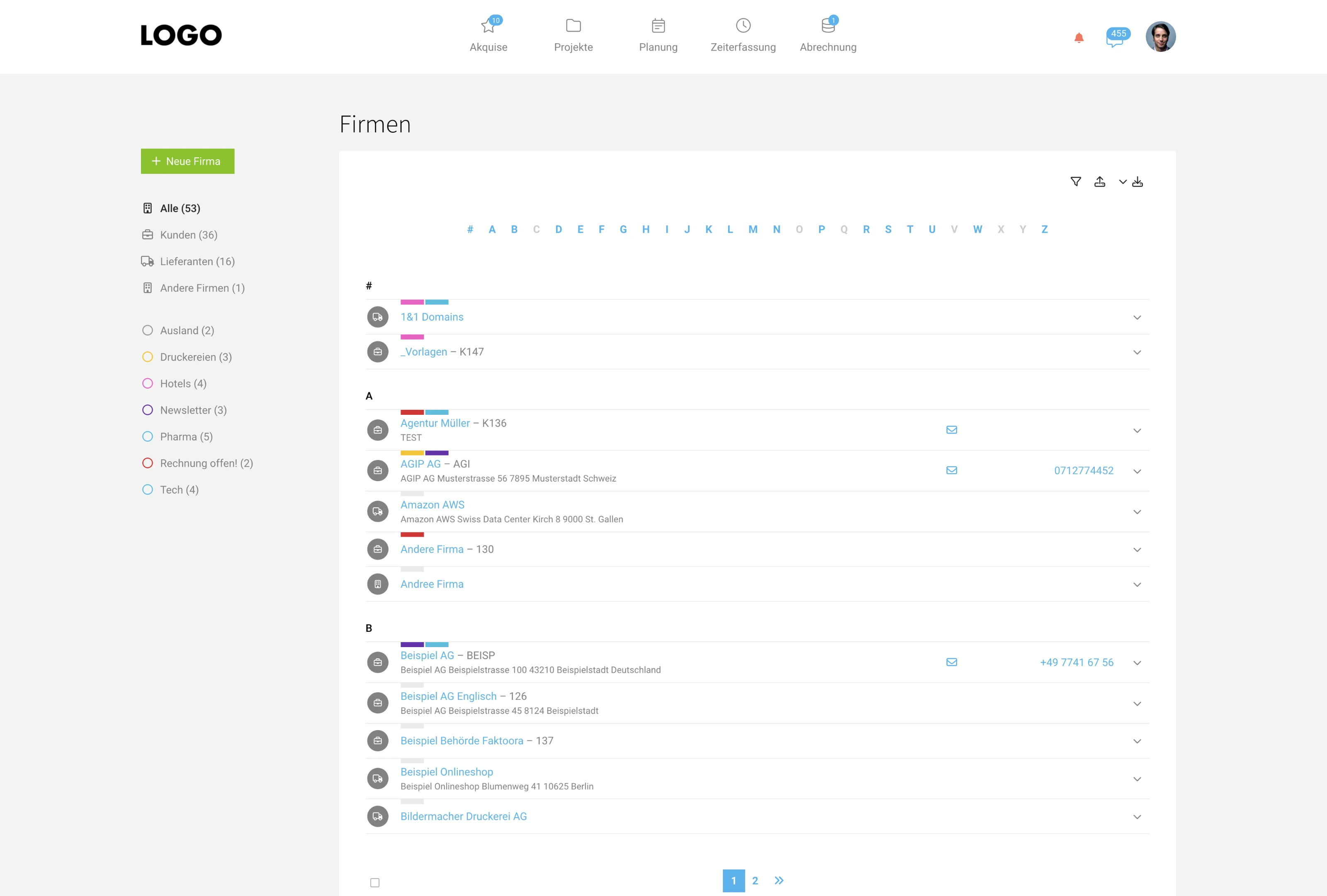 Finde Firmen oder Personen nach Branche, Status, Ort oder Projektbezug – sekundenschnell.