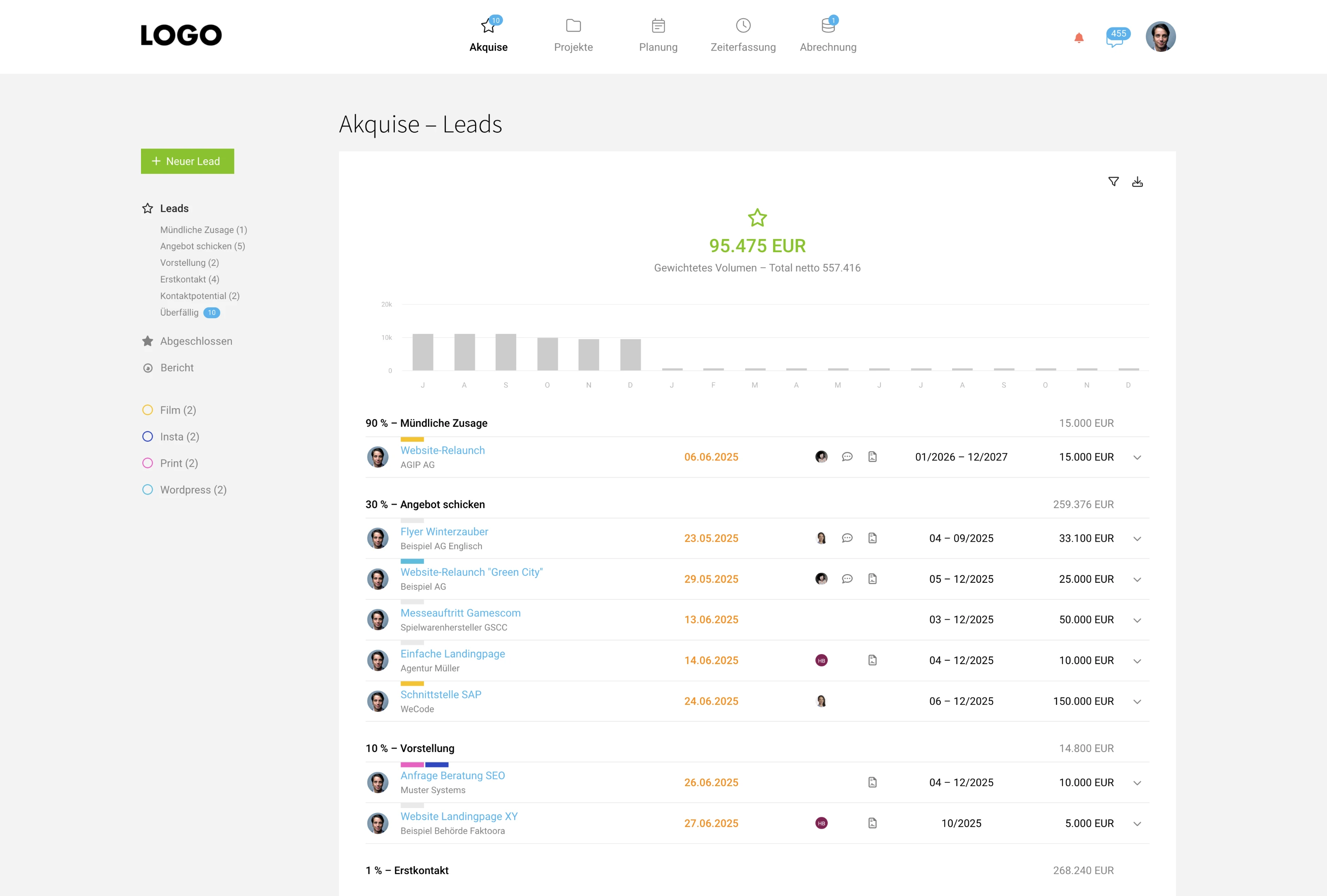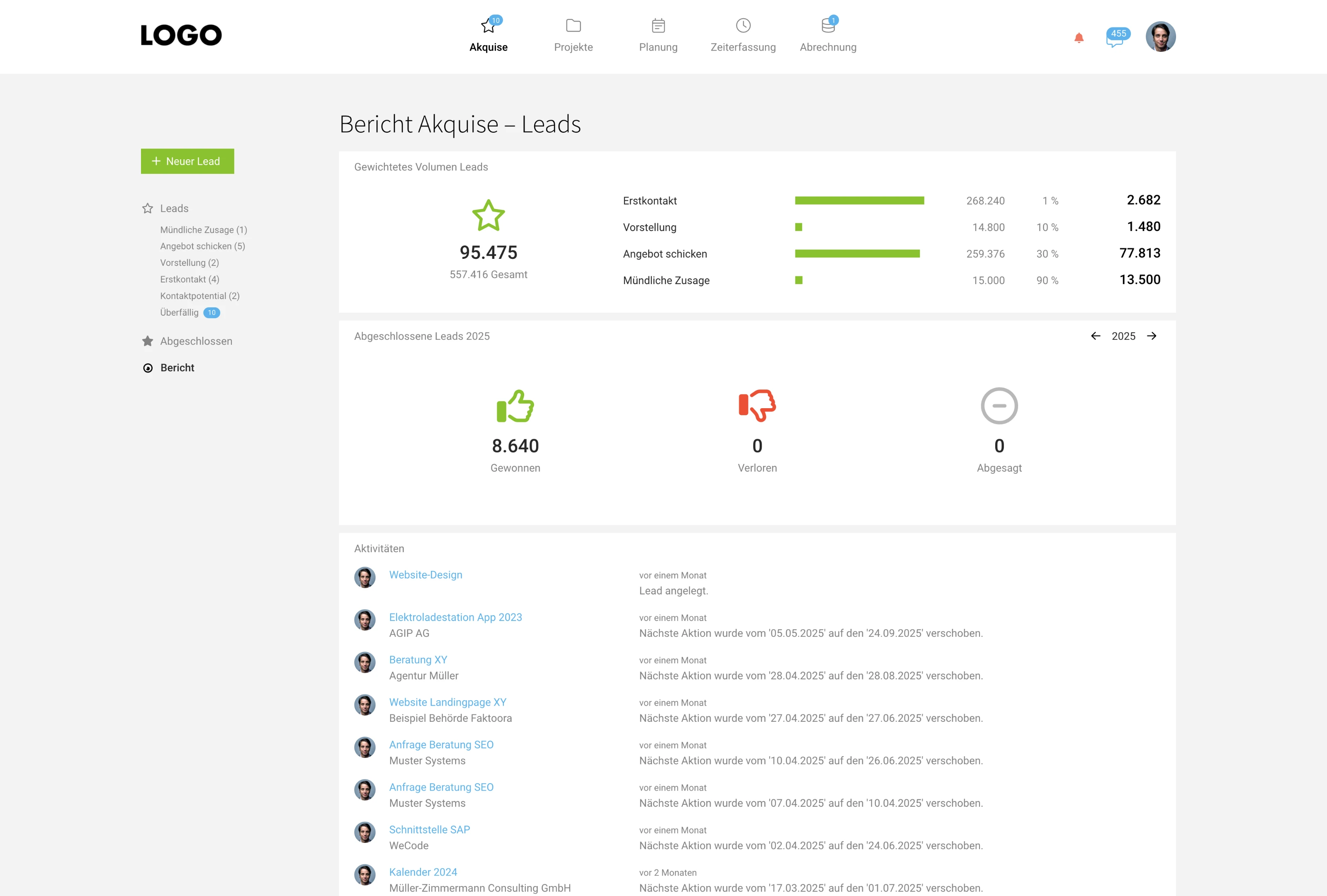 Verwalte Leads in übersichtlichen Phasen, hinterlege Aktivitäten, qualifiziere Kontakte und überführe sie direkt in ein Angebot oder Projekt. Alle Vertriebsaktionen sind dokumentiert – so bleibt nichts liegen.